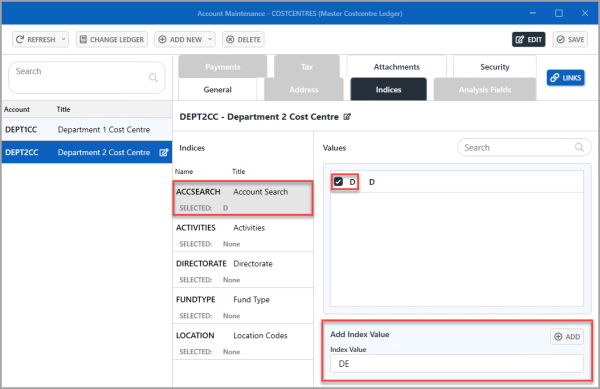 1. Select the Indices tab. If you have previously saved this cost centre, you need to select EDIT to enable applicable fields.