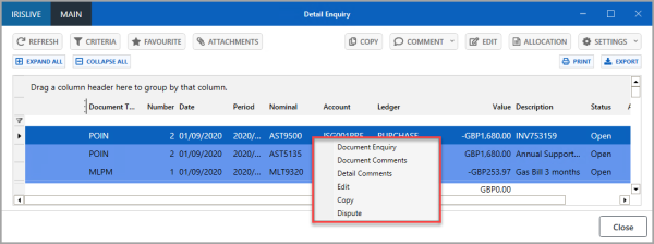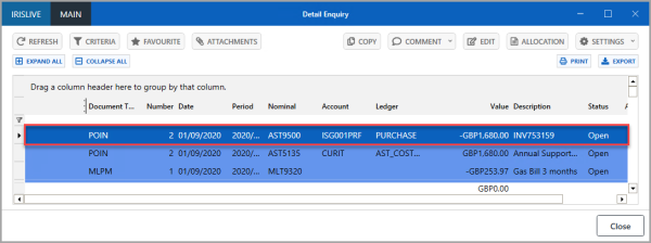 A detail enquiry (previously Account Enquiry) is used to view documents that have been added to IRIS Financials to record your establishment/organisation's transactions. From the Detail Enquiry window you can copy, edit, dispute, and allocate documents. You can also set the criteria to assist in exporting lists of documentation data or create reports. For more information, please see Running a Detail Enquiry.