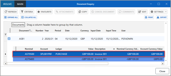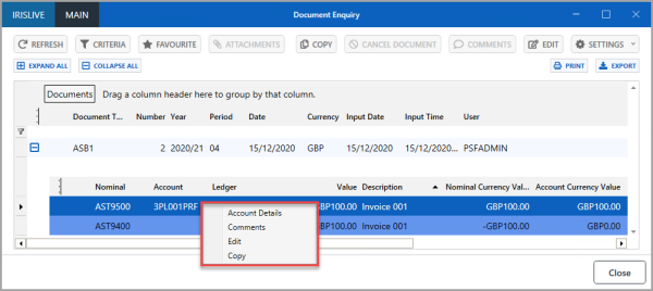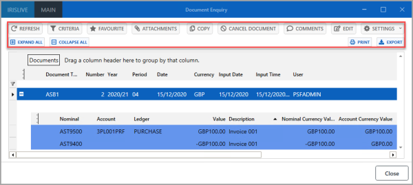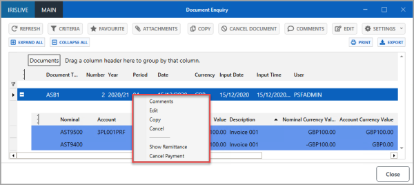 A document enquiry is used to view documents that have been added to IRIS Financials to record your establishment/organisation's transactions. From the Document Enquiry window you can copy, edit, and cancel documents. You can also set the criteria to assist in exporting lists of documentation data or create reports. For more information, please see Running a Document Enquiry.