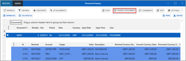 6. The Document Enquiry dialog is displayed. Select CANCEL DOCUMENT.
