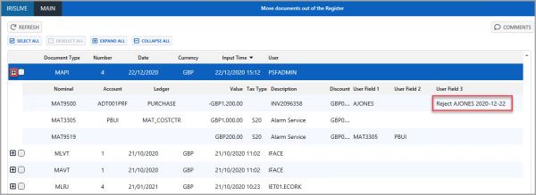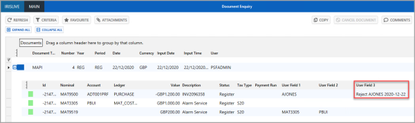 2. Select the Expand (+) button to expand the applicable document. Check User Field 3 to confirm the document has been rejected. If you are unable to see User Field 3, you can add it in by right-selecting on the column header row on the detail line.