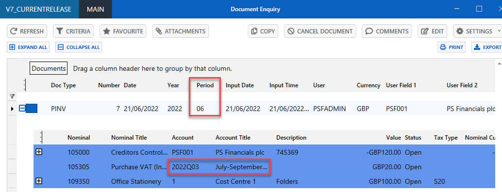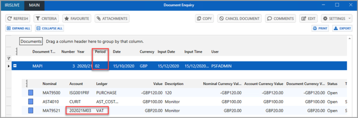When a document is posted in IRIS Financials transactions are posted to an accounting period and a VAT period/quarter, both of which are independent of each other. This means that transactions can be posted to differing accounting and VAT periods/quarters. This typically occurs if an invoice has been received late and the VAT return for that period has already been completed.