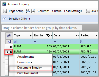 Right-click on the grey box to the left of the applicable document and select Document Enquiry from the pop-up menu.