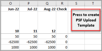 1. When the Budget Upload Template has been completed, select the Press to Create PSF Upload Template button on the top right of the template. This will generate the budget data required for the import onto a separate sheet within the spreadsheet workbook entitled Import Data. Select the OK button on the message dialog when complete.