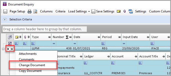 The Document Enquiry dialog is displayed. Right-click in the grey box to the left of the document header line and select Change Document.