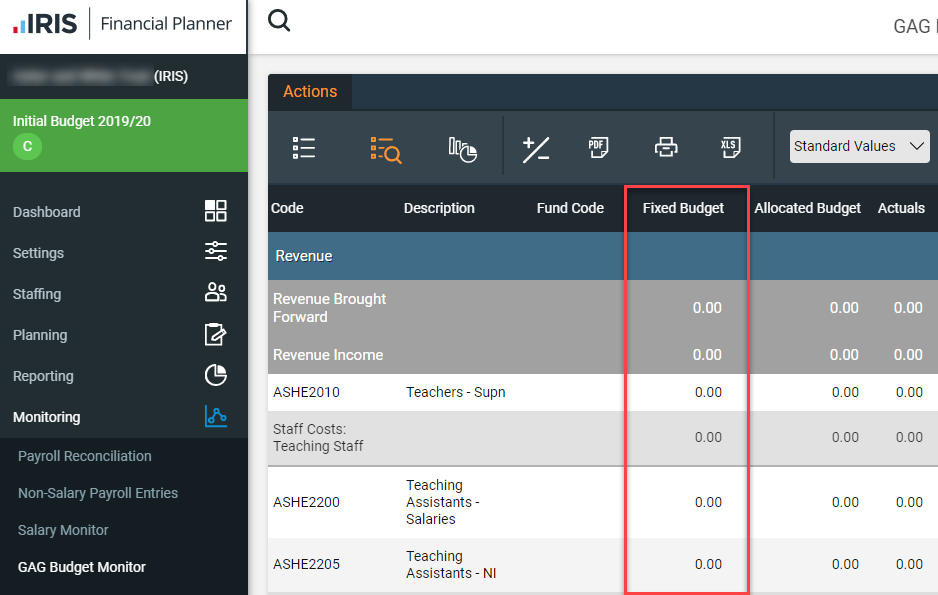 This setting is optional. Entering a budget code here allows you to track your performance against your original budget at the start of the year. It displays in the Fixed Budget column in your IRIS Financial Planner Budget Monitor.