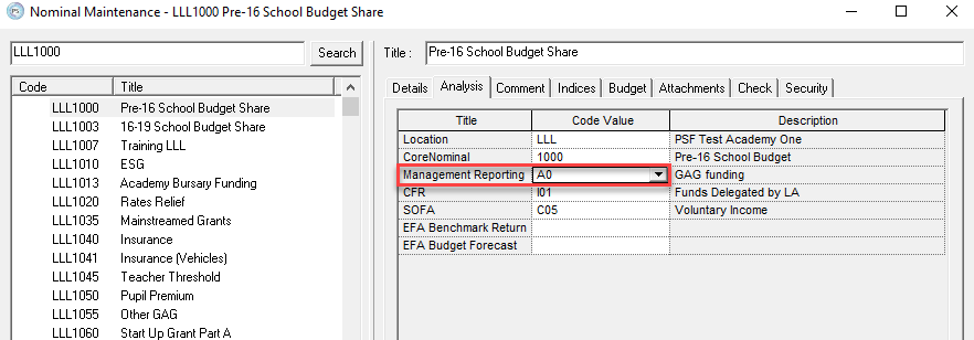 GAG Reporting will typically be used by most academies. If you have configured IRIS Financial Planner to use GAG (Government Annual Grant) codes, IRIS Sync must determine which GAG code each nominal is mapped. It does this by examining the Analysis Code for each nominal in IRIS Financials. This is the Management Reporting Analysis Code which is stored in the Analysis tab against each nominal.