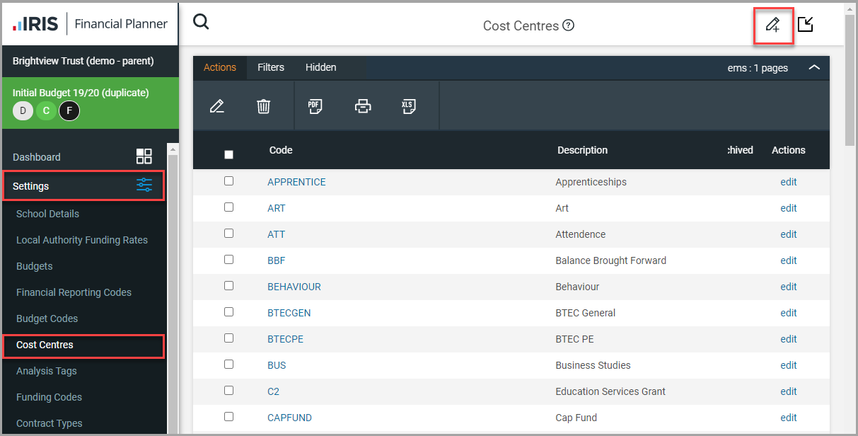 Go to Settings > Cost Centres, then select New.