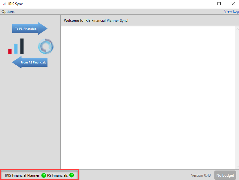 - IRIS Sync opens. There should be a green light next to both IRIS Financial Planner and PS Financials at the bottom of the window.