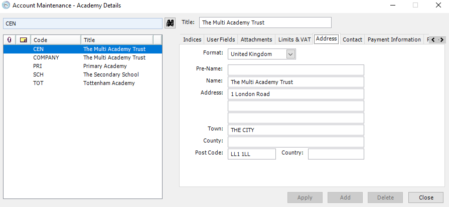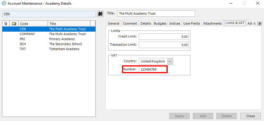 1. In IRIS Financials select Masters > Accounts > ACADEMY and select the applicable location. Select the Limits & VAT tab. The VAT Number field must show the location's VAT registration number.