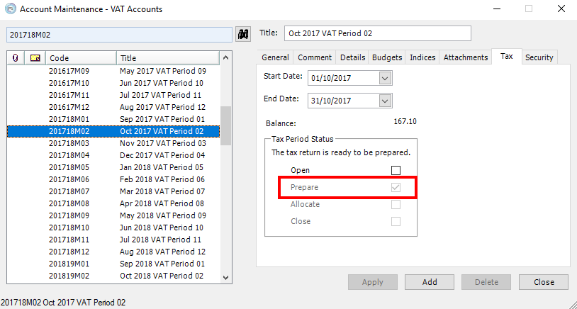 4. Select the applicable VAT Period/Quarter. Select the Tax tab, selectPrepare then click Apply. This will stop any new transactions being posted into the VAT period/quarter.