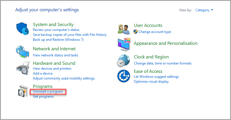 Open the Control Panel and select Uninstall a Program.