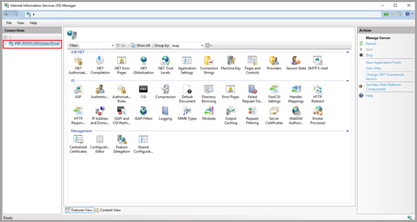 The Internet Information Services (IIS) Manager window displays. Expand the menu in the Connections panel on the left-hand side of the window.