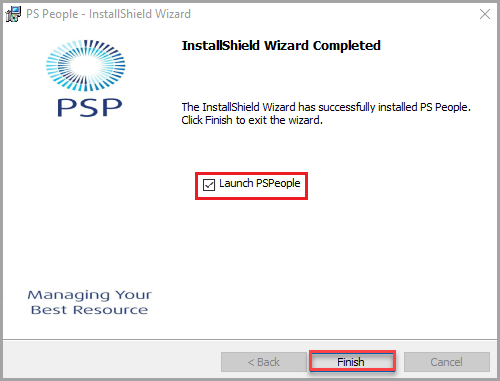 PS People update installs. When the installation is complete, de-select the Launch PSPeople , then click Finish to close the installation wizard.