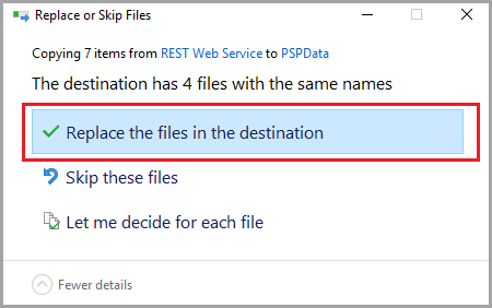Navigate back to the following file path: C:\inetpub\wwwroot\PSPData. Paste the three copied items into this folder. The Replace or Skip Files displays. Select the Replace the files in the destination.