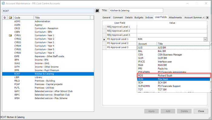 Select the applicable PO Approval Level field based on your purchasing workflow (which determines who approves a requisition or requisition based on their approval limits). contains the previous authoriser, i.e. PO Approval Level 1. Select the correct approver from the drop-down list. e.g. RDS (Richard Smith).