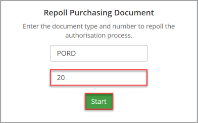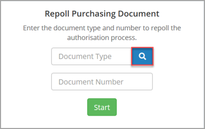 The Document Type field displays the selected type. Enter the applicable document number in the Document Number field (ascertained from the Unauthorised Purchase Order or Unauthorised Requisition report) then click the Start button.