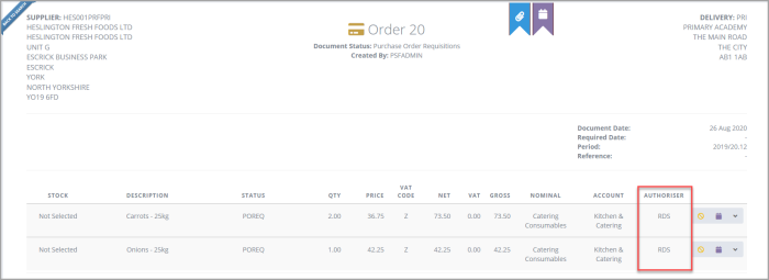 In our example, purchase order 20 was displaying RHN as the authoriser. After the document has been successfully repolled, the new approver now correctly displays (RDS in our example).