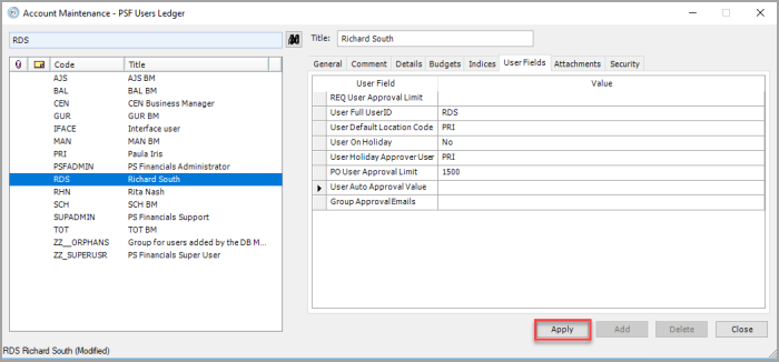 Select the new approver from the User Holiday Approver User drop-down list, e.g. RDS - Richard South, then click the Apply button. This will ensure that any documents already awaiting approval from the old approver, will transfer to the new approver within 72 hours. You can manually force these through to the new approver immediately if you do not want to wait. For more information, see Update the requisition or purchase order with the new approver section.