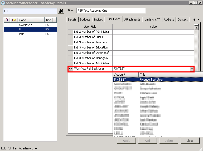- In the Workflow Fall Back User field, select the applicable user from the drop down list as shown in the graphic below: