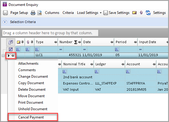 - The Document Enquiry window is displayed. Right-click on the grey box on the top line of the document and select Cancel Payment from the drop-down menu as shown in the following graphic.