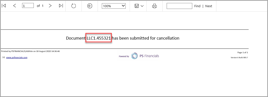 - A report will generate to inform you that the document has been submitted for cancellation.