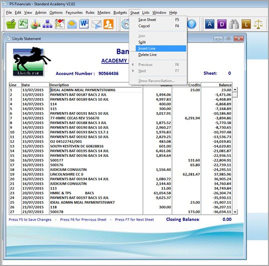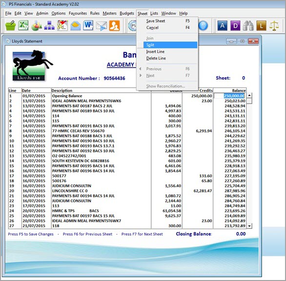 Balance – The balance will automatically populate based on the debit / credit values you have entered. - If there are no other entries on the sheet, press F5 to save. Otherwise, click Sheet from the main menu bar and select Split.