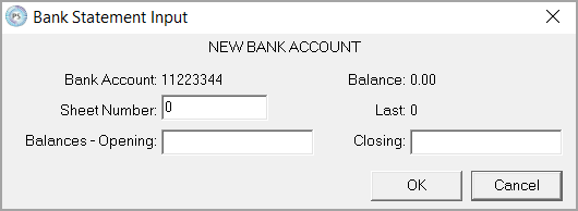 - The Bank Statement Input prompt displays. Enter 0 in the Sheet Number field and click the OK button.
