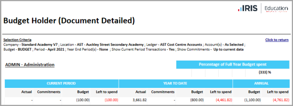 Commitments: This shows any purchase orders that have not been invoiced for the current financial year up to the chosen period. These transactions are shown at the bottom of the report.