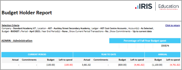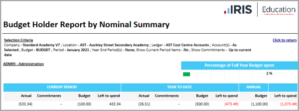 Left to spend: This sums the Year to Date, Actual and Commitment values and subtracts them from the annual Budget value. This shows the amount left to spend against budget for the financial year.