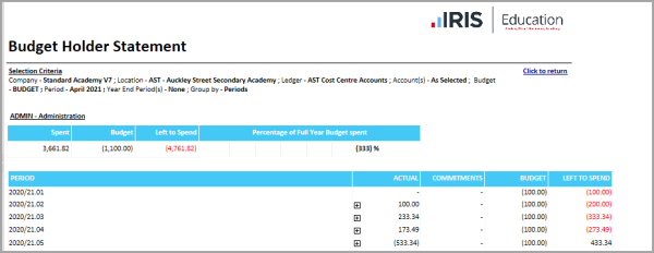 The Budget Holder Statement report shows the spend against a specified account for each period grouped by nominal or period. This report allows you to expand the initial results to see the transactions making up the amounts.