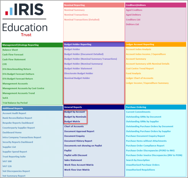 - The IRIS Financials Reporting Services Browser is displayed. The budget reports are available from the General Reports and Budget Holder Reporting sections.