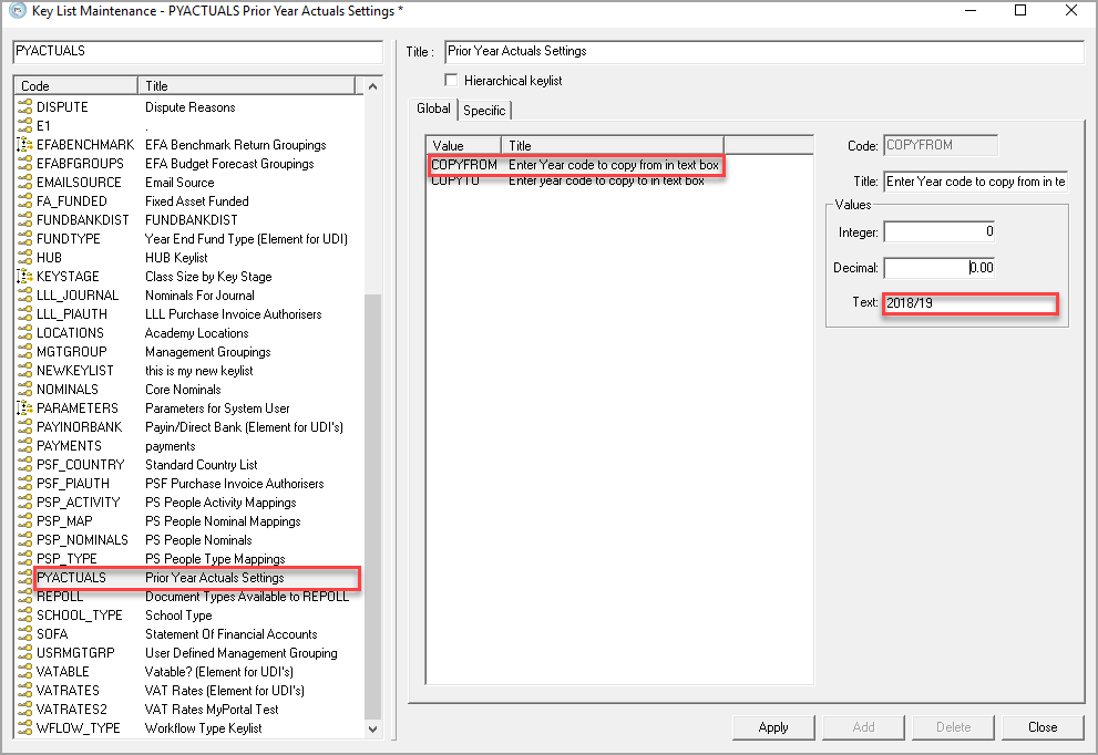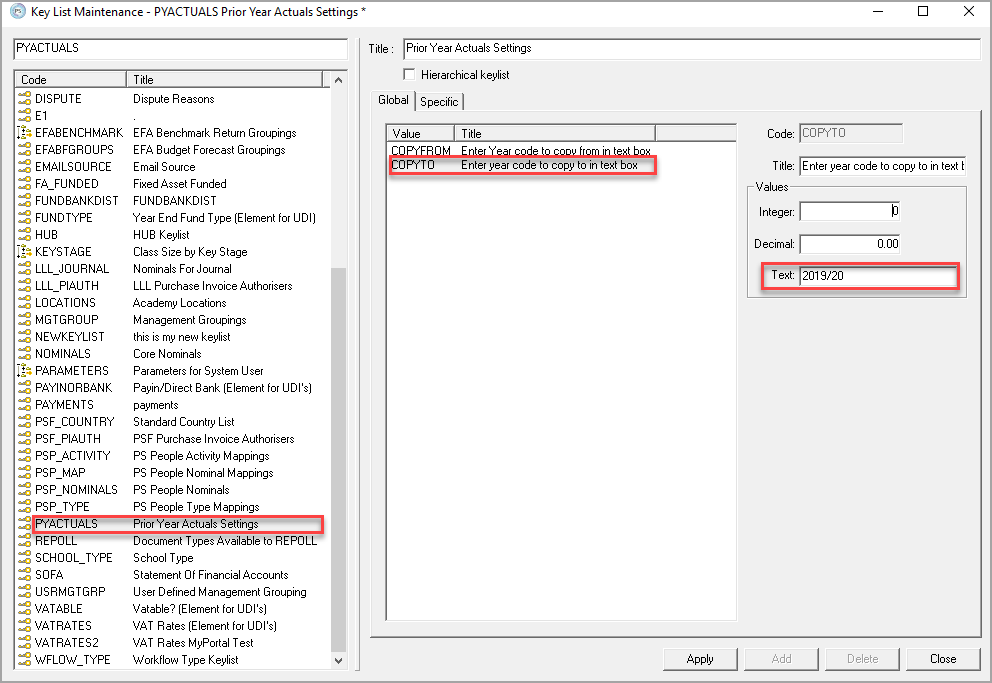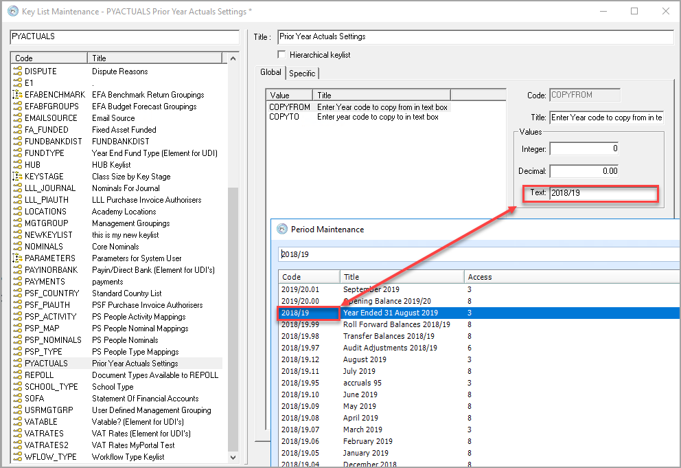 Highlight the COPYFROM value then enter the financial year that you wish to copy the actuals from in the Text field. This should be in the format that it appears in the Period Maintenance dialog (use the code for the Year Ended period as shown in the following graphic). In most cases this will be in the YYYY/YY format, e.g. 2018/19 but can be checked by selecting Masters > Periods from the menu bar.