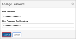 The Change Password dialog is displayed. Enter the new password for the user in New Password, then enter the same password again in New Password Confirmation. This is the password they can now use to log into PS Cloud with until they change it.