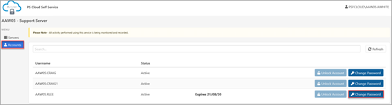 The Accounts page is displayed. Click Change Password adjacent to the required user.