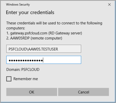 - The Windows Security dialog is displayed for you to enter your login credentials. Enter the domain name PSFCLOUD\ followed by the username. This is typically the server name, a full stop, the first initial, then the surname e.g. PSFCLOUD\AAW05.JSMITH
