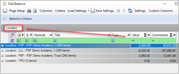 - On the Trial Balance window, group the results by location. Click and hold the Location column heading, then drag it up to the Drag a column header here to group by that column message.