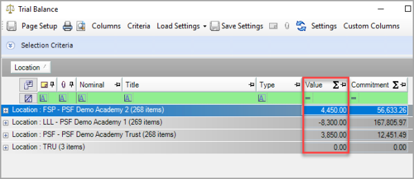 The results in the Trial Balance window are updated to display by Location. In the Value column, the value against the location should be displayed as GBP0.00. If the amount in the Value column displays an amount other than 0.00, you need to investigate by checking for any entries that have been posted across multiple locations where no intracompany document has been used to balance the transaction. For more information, please see Investigating Location Differences.