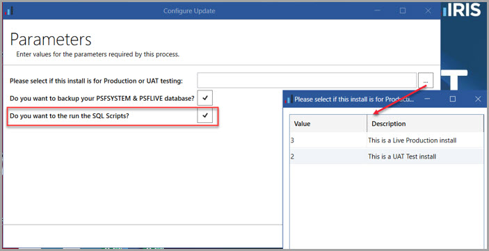 From Parameters, select Do your want to the run the SQL scripts?, then select 3 — This is a Live Production install.