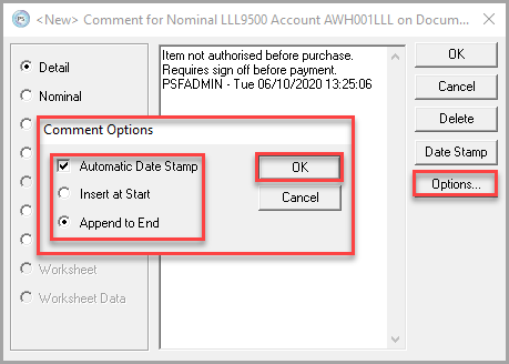 - You can change the settings of the date stamp so that it is applied automatically to comments, either at the beginning of your comment or after, as shown in the previous graphic. To change this setting to your preferred method, click the Options button to display the Comment Options dialog. Select the Automatic Date Stamp check box, then use the radio buttons to select Insert at Start or Append to End. Click the OK button to confirm your selections.