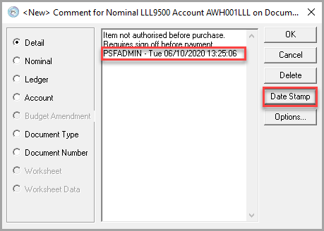 - Add the date and time the comment was added by clicking the Date Stamp button. The user name, date and time are added to the comment as shown in the following graphic.