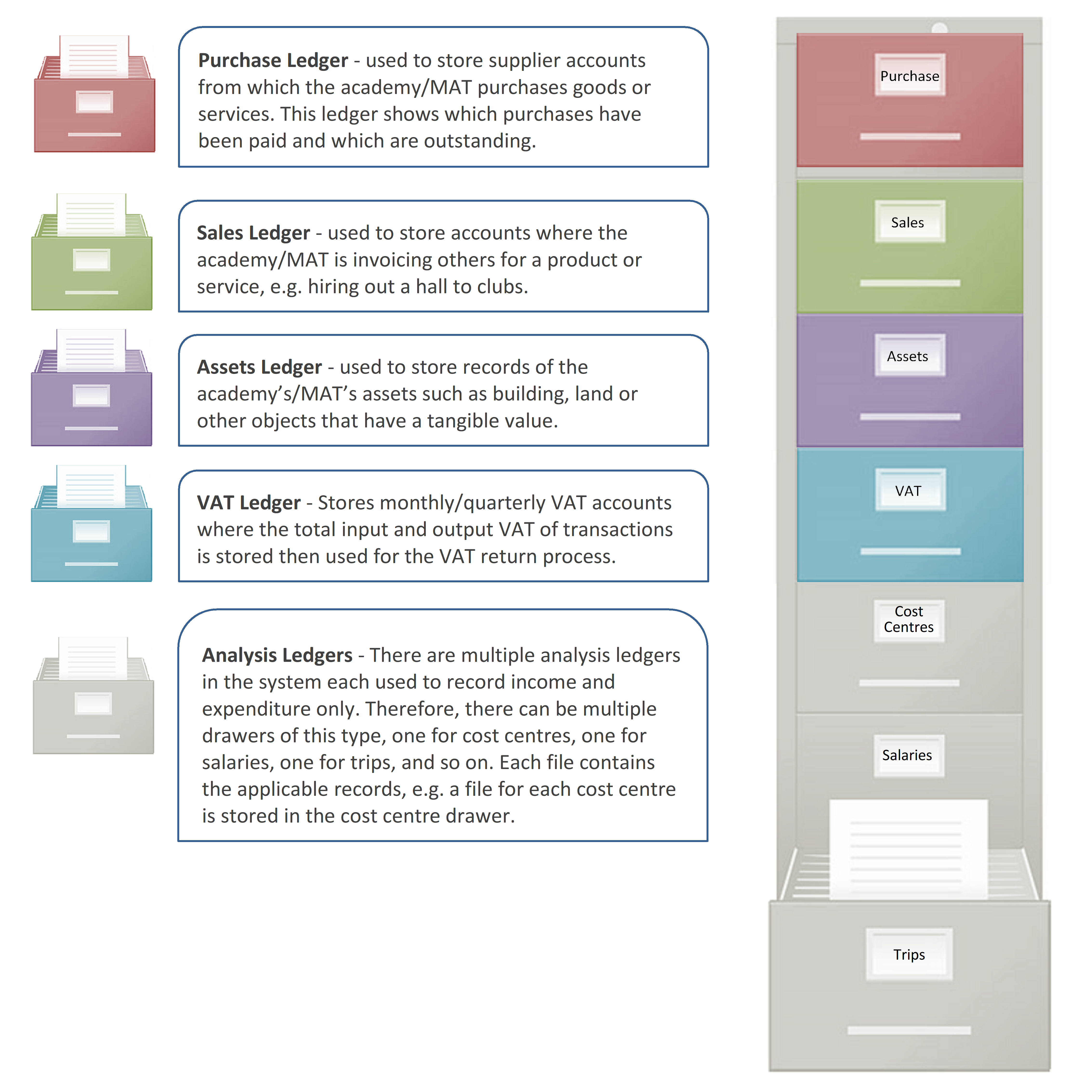 There are several types of ledger available within the system. These determine what information is stored within the ledger and therefore what information is required when creating an account to be stored in that ledger. Each ledger can be likened to a drawer within a filing cabinet where each drawer contains all the information relating to that ledger.