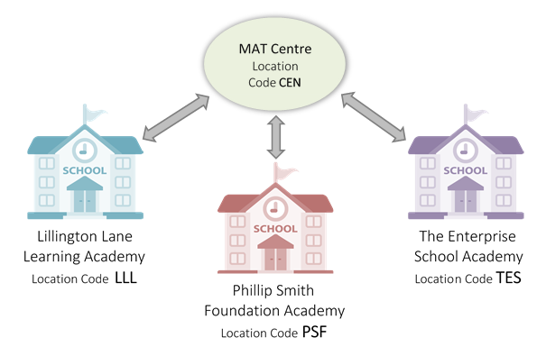 The following diagram demonstrates a typical MAT setup where each academy is added as a separate location account with a three-character location code.