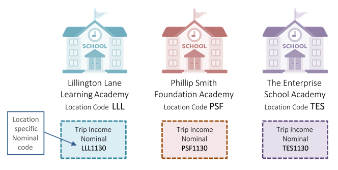 Using the locations codes, academy specific data can be created including nominals, ledgers, cost centres, etc. This enables a further level of accounting and reporting. The following diagram shows each academy has a nominal for recording trip income: