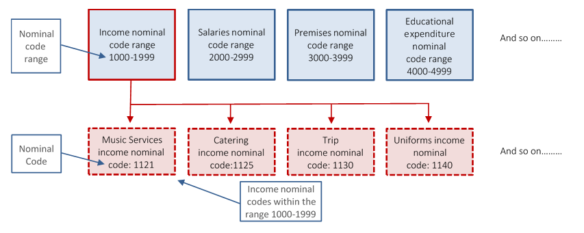 Nominals consist of a code and a title, e.g. 4020 - Stationery. They are grouped into numbered ranges based on related categories. For example, income nominals have codes within the 1000s, salaries within the 2000s, premises within the 3000s and so on.