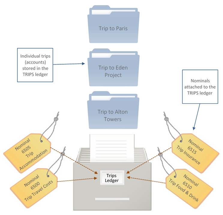 Ledgers however, can be linked to multiple nominals. For example, the Trips Ledger (which is an analysis ledger) is attached to several nominals. This is because several things can/need to be recorded that relate to trips.