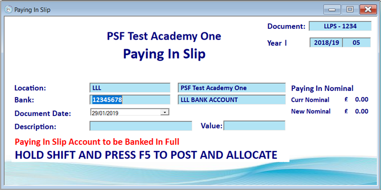 These are set up by PS Financials as part of the installation process. The locations are stored within the ACADEMY ledger as individual accounts. Each account will have a three-character code.