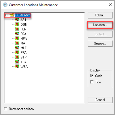 - The Customer Locations Maintenance dialog is displayed. Ensure that COMPANY is selected, then click Location.