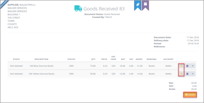 When cancelling a document, the internal links to these related documents are broken. We therefore recommend taking note of any related documents before cancelling, if required. This is achieved by clicking the View Events icon at the top of the document, then clicking the Links tab. A good idea is to write the document numbers in Rejection Comments (as shown in the following step). - To cancel a specific item (for example, you were told all the exercise books had arrived, but in fact only the blue ones were delivered), click the Cancel icon adjacent to the required item. To cancel the whole document (for example, if incorrect items had been sent), click Cancel at the bottom of the document.