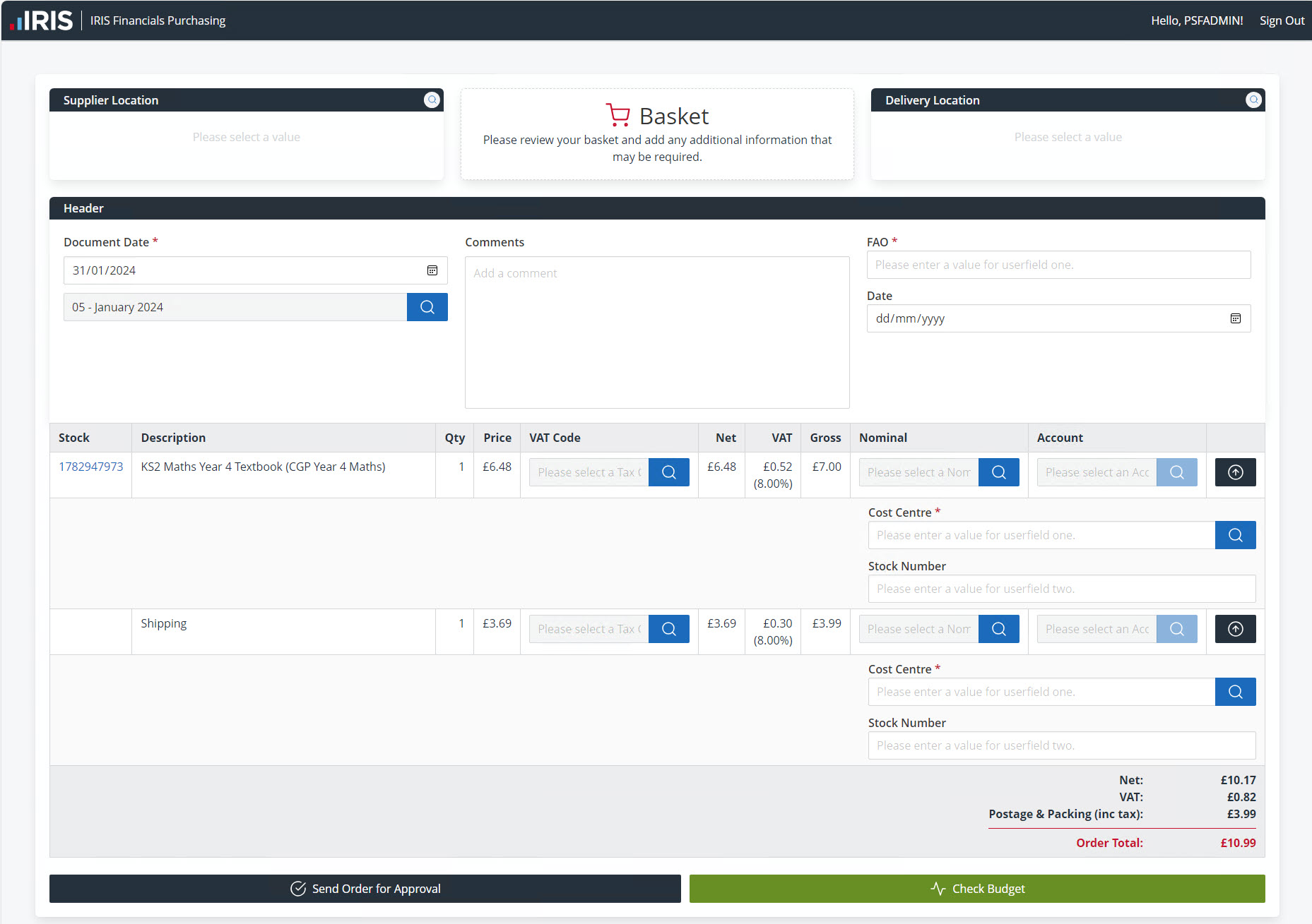 After placing an E-Procurement order through IRIS Financials Purchasing, before posting it to IRIS Financials, the order details must be checked and any required additional information entered.